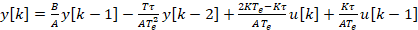 yk=yk1*B/A-yk2*(T*tau)/(A*Te*Te)+uk*((2*K*Te)-K*tau)/(A*Te)+uk1*(K*tau)/(A*Te)