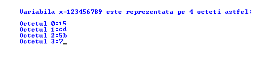 cout << "\n\n\tVariabila x=123456789 este reprezentata pe 4 octeti astfel:";