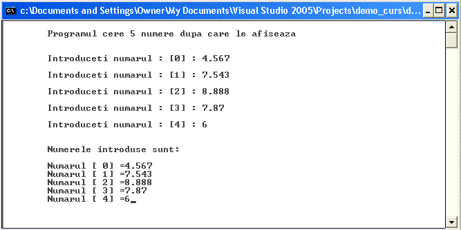 cout << "\n\tProgramul cere 5 numere dupa care le afiseaza \n\n";