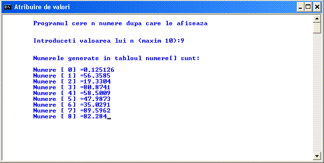 cout << "\n\tProgramul atribuie n valori aleatoare dupa care le afiseaza \n\n";