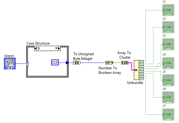 vector binar. In urma conversiei "Array to Cluster" obtinem o structura de date pe care daca o despachetam cu functia "Unbundel" obtinem