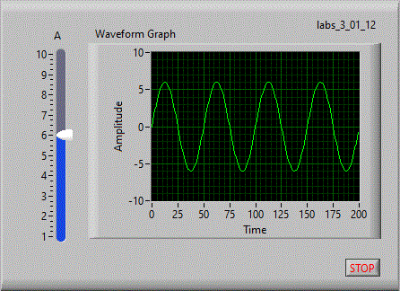 Folosind instructiunea For-Loop afisati un semnal sinusoidal intr-un Indicator "Waveform Graph". Amplitudinea