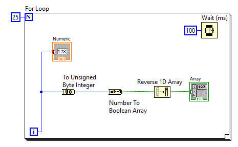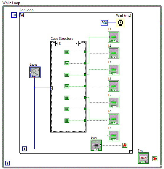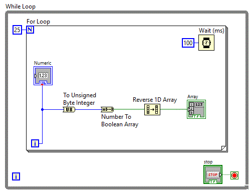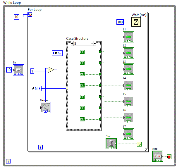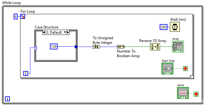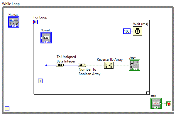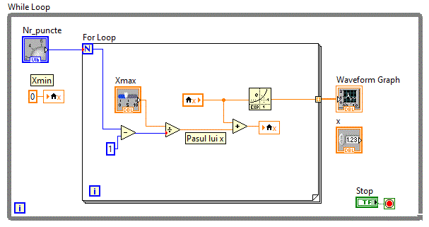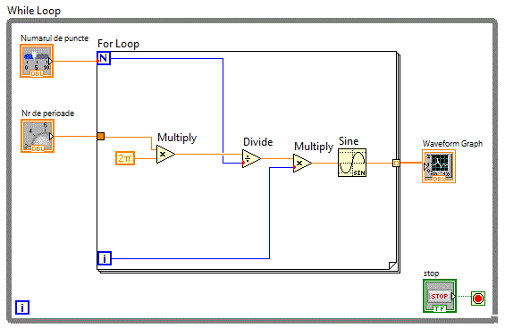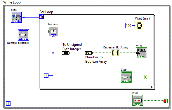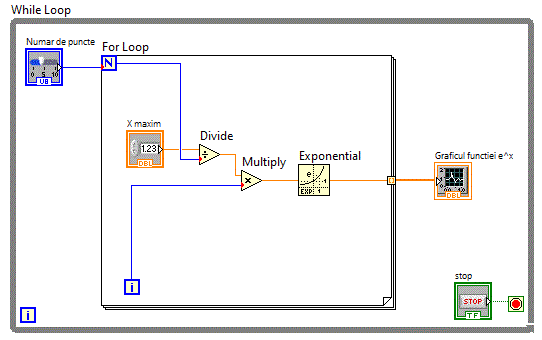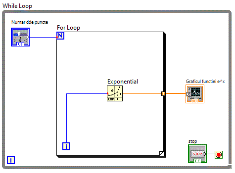 Diagrama bloc va trebui deci sa contina o structura "For Loop" inclusa intr-o structura "While Loop"