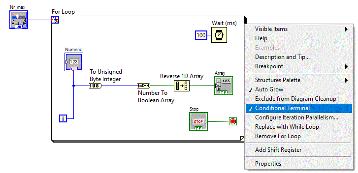 Validarea optiunii "Conditional Terminal" se face folosind click-dreapta pe structura "While Loop".