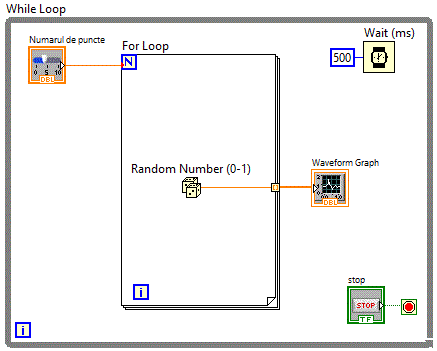 Vom folosi un generator de numere aletoare si vom afisa valoril generate intr-un control de tipul Waveform Graph