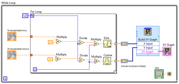 Pe diagrama bloc vom conecta la intrarea controlul XY Graph cele doua valori: sin(x) si cos(y)