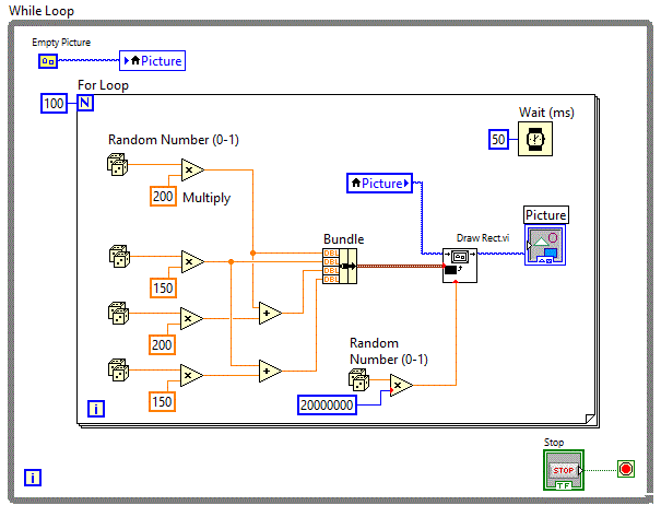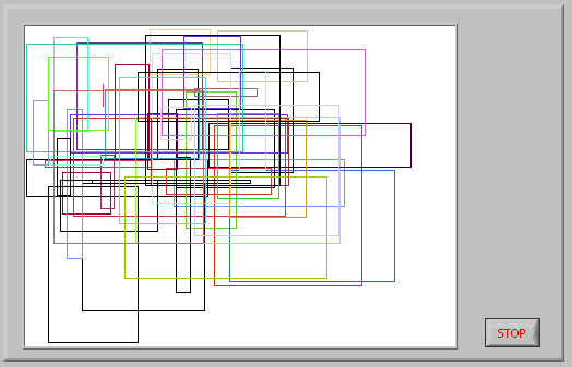 Se va folosi o structura "For Loop" pentru a trasa dreptunghiuri de dimensiuni si culori aleatoare.
