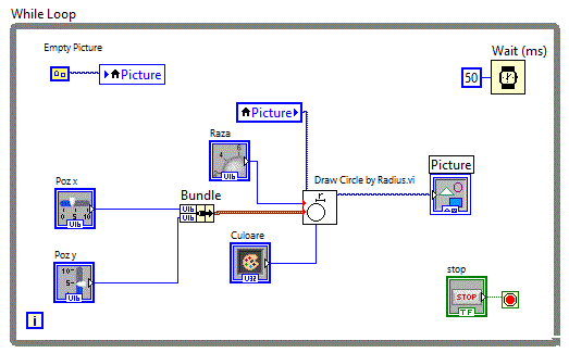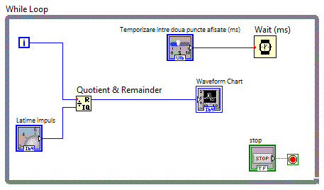 Diagrama bloc va contine o structura "While Loop" in interiorul careia se include partea de aplicate ce trebuie repetata.