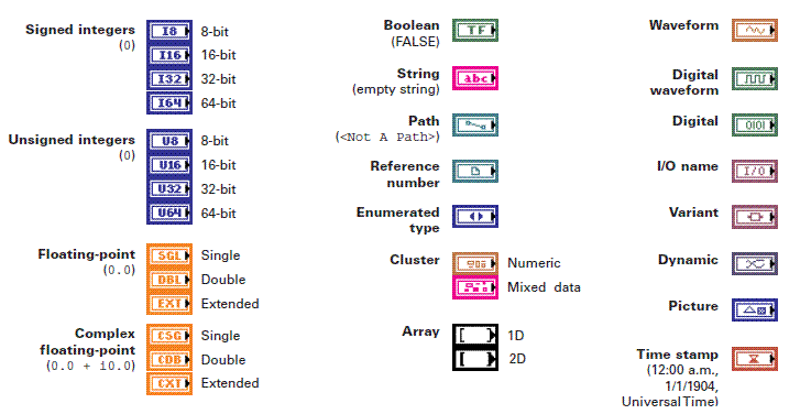 Toate tipurile de date enumerate mai sus pot fi utilizate si plasate pe Block Diagram. Fiecare tip de data
