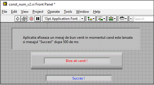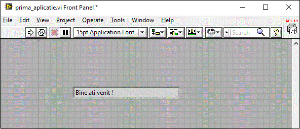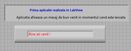 Prima aplicatie realizata va scrie textul "Bine ati venit!" intr-un Front Panel de genul celui de jos.