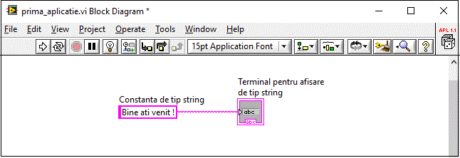Cu unealta Connect Wire selectata, putem conecta terminalul de tip Constant String cu Terminal de tip string.
