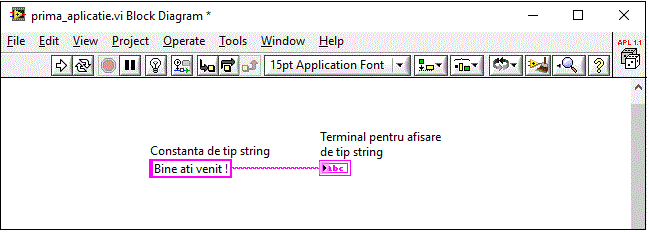 Din Tools Palette se selecteaza Operate Value si se modifica valoarea terminalul de tip Constant String in "Bine ati Venit".