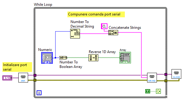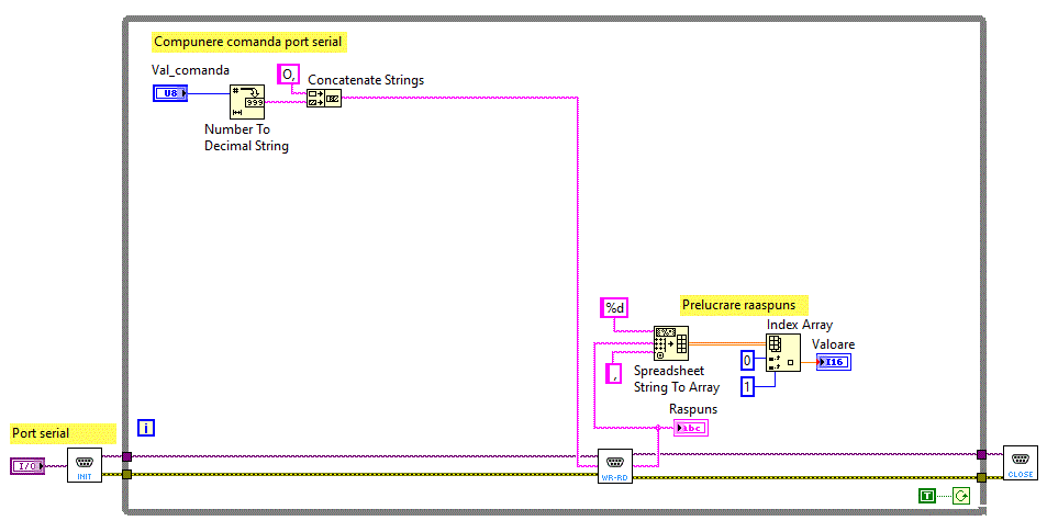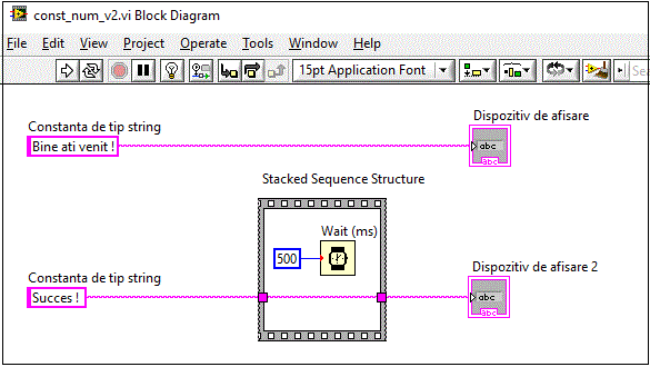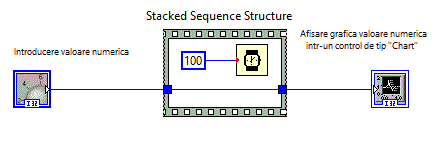 Pe diagrama bloc s-a plasat o structura secventiala de tipul:Stacked Sequence Structure sau Flat Sequence in care am
