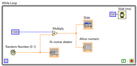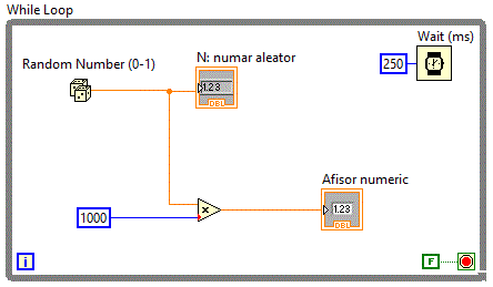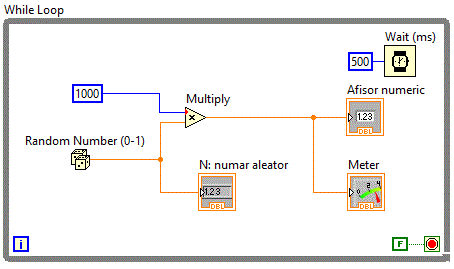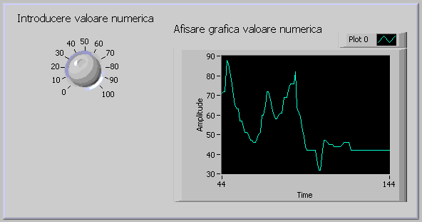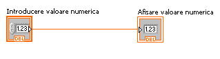 in momentul rularii aplicatiei. Pentru aceasta vom plasa pe Front Panel un Numeric Indicator iar pe Block Diagram vom plasa o