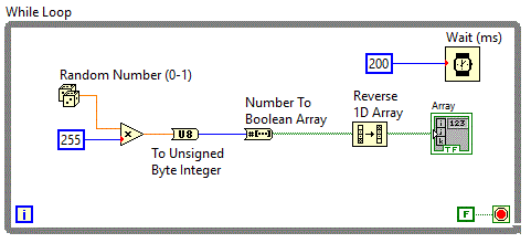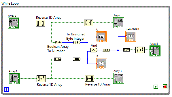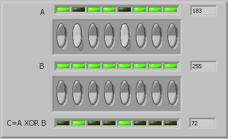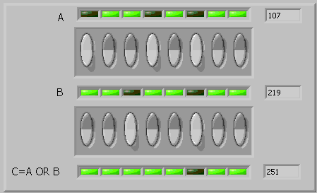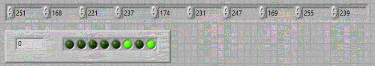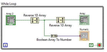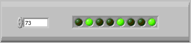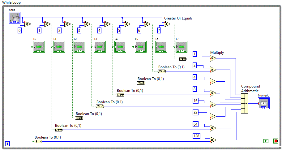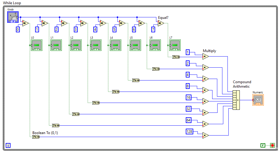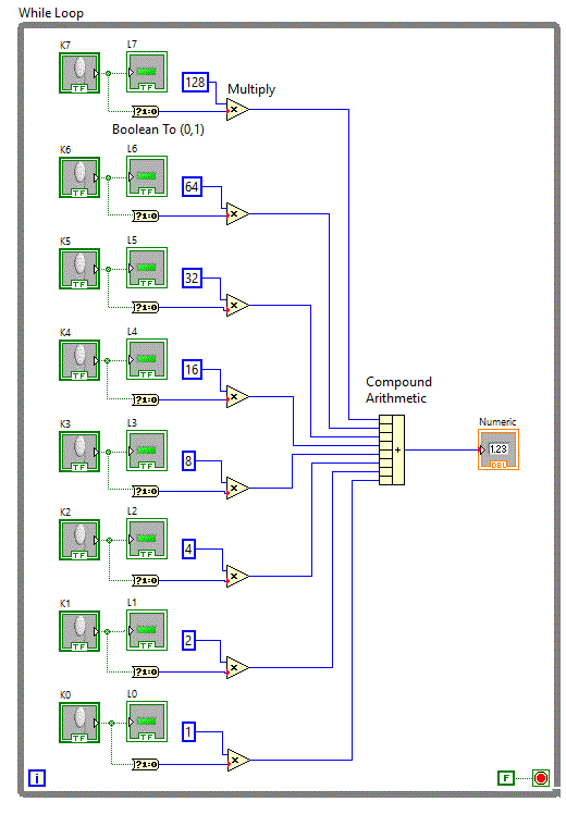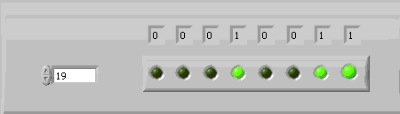 comutatoare si un tablou de leduri iar conversia se realizeaza folosind functia "Boolean Array To Number" aflata in grupul Programming => Numeric => Conversion.