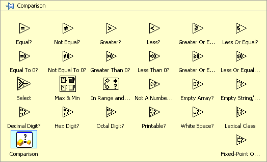 In LabVIEW exista o serie de functii grupate in Programming => Comparison care pot fi folosite in expresii relationale.