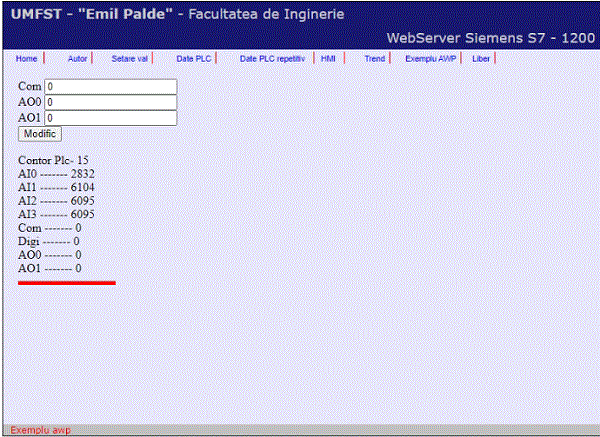 <!-- AWP_In_Variable Name='"Com"' --> <!-- AWP_In_Variable Name='"AO0"' --> <!-- AWP_In_Variable Name='"AO1"' --> <form method="get" action="set_val.html"> <input type="submit" value="Modific"> Com <input type="text" name='"Com"'value=':="Com":'> AO0 <input type="text" name='"AO0"'value=':="AO0":'> </form> |