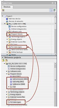 2. Se creeaza un nou proiect in TIA Portal, unde se adauga configuratia PLC-ului. In paralel se dezarhiveaza proiectul descarcat si se deschide. Din proiectul descarcat se copiaza urmatoarele elemente in noul proiect creat:
