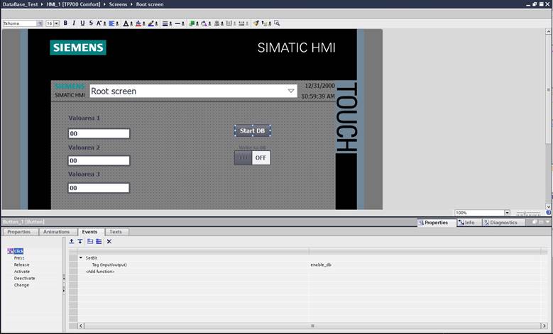 9. Pentru butonul de “Start” se adauga un eviniment de tip “Click”, pe care se adauga functia “SetBit” la care ii se atribuie tag-ul “enable_db”. Acest tag se conecteaza cu tag-ul din PLC conform figurii.