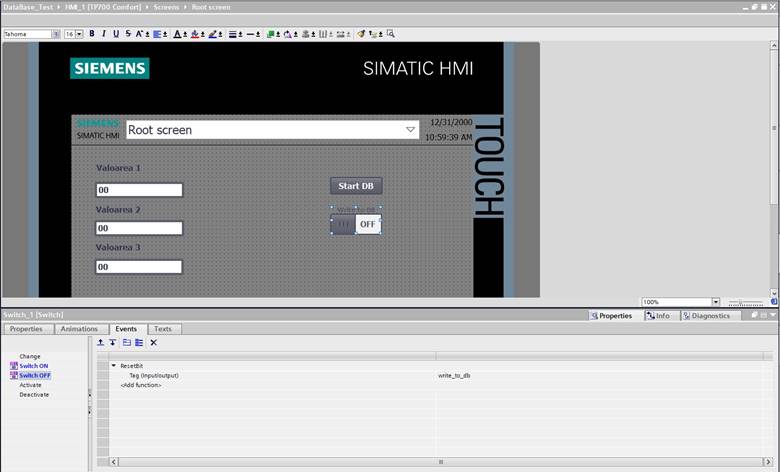 10. Pentru switch se adauga pe evenimenul “Switch ON” functia SetBit si ii se atribuie tag-ul write_to_db. Pe evenimentul “Switch OFF” se adauga functia “ResetBit” careia ii se atribuie tag-ul “write_to _db”