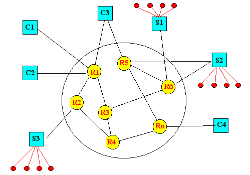 Internetul este compus dintr-o multitudie de noduri de internet R1,R2,R3,...,Rn in care se gasesc Routere cu rolul de a dirija pachetele de informatie.