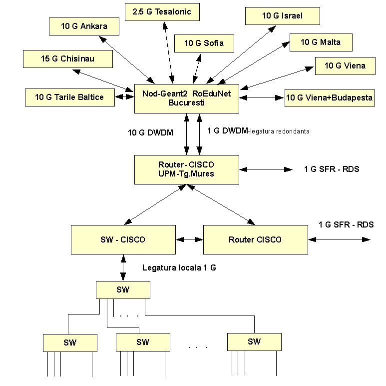 redondanta cu 2 ramuri spre nodul Geant2 RoEduNet situat in Bucuresti. Ramura principala este realizata cu fibra optica Dark Fibre 1320-2200 nm .