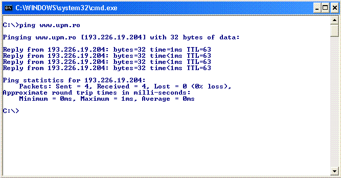 Pentru a afla adresa IP a unui server, putem folosi comanda cmd ping Sa aflam de exemplu adresa IP a serverului www.upm.ro