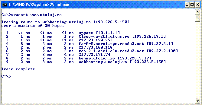 Am putea de exemplu sa accesam pagina www.upm.ro utilizand: http://193.226.19.204/ Sa presupunem ca vrem sa accesam pagina www.utcluj.ro. cu comanda tracere www.utcluj.ro obtinem: