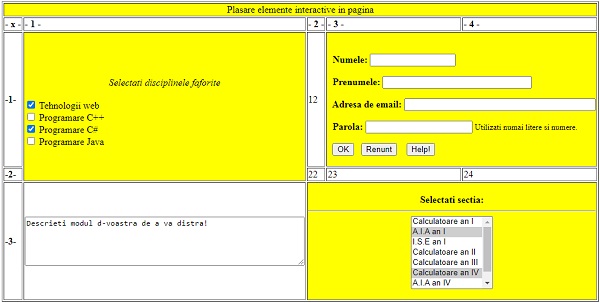 Folosind marcatorul "Table" si parametrii "rowspan" respectiv "colspan" plasati diverse elemente interactive intr-o pagina.