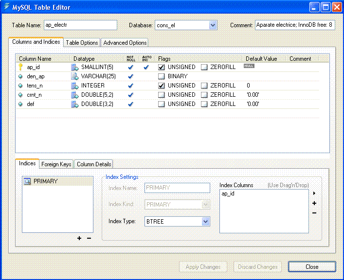 CREATE TABLE cons_el . ap_electr ( ap_id SMALLINT UNSIGNED NOT NULL AUTO_INCREMENT, den_ap VARCHAR(25) NOT NULL, tens_n INTEGER UNSIGNED NOT NULL, crnt_n DOUBLE(5,2) NOT NULL, def DOUBLE(3,2) NOT NULL, PRIMARY KEY( ap_id ) ) ENGINE = InnoDB COMMENT = 'Aparate electrice'; |