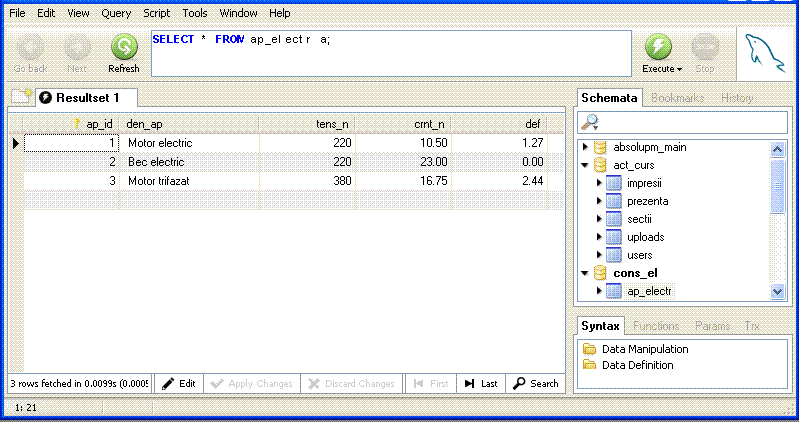 INSERT INTO ap_electr ( ap_id , den_ap , tens_n , crnt_n , def ) VALUES (1,'Motor electric',220,10.50,1.27), (2,'Bec electric',220,23.00,0.00), (3,'Motor trifazat',380,16.75,2.44); |