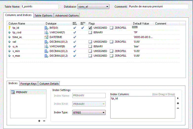 DROP TABLE IF EXISTS `t_points`; CREATE TABLE `t_points` ( `tp_id` int(10) unsigned NOT NULL AUTO_INCREMENT, `tp_cod` varchar(7) NOT NULL DEFAULT 'TP', `time_ac` datetime NOT NULL DEFAULT '0000-00-00 00:00:00', `val` decimal(10,2) NOT NULL DEFAULT '0.00', `u_m` varchar(9) NOT NULL DEFAULT 'bar', `v_min` decimal(10,2) NOT NULL DEFAULT '0.00', `v_max` decimal(10,2) NOT NULL DEFAULT '0.00', PRIMARY KEY (`tp_id`) ) ENGINE=InnoDB AUTO_INCREMENT=8 DEFAULT CHARSET=latin1 COMMENT='Puncte de masura presiuni'; /*!40000 ALTER TABLE `t_points` DISABLE KEYS */; INSERT INTO `t_points` (`tp_id`,`tp_cod`,`time_ac`,`val`,`u_m`,`v_min`,`v_max`) VALUES (1,'TP 01','2010-05-01 20:32:07','678.00','bar','0.00','1023.00'), (2,'TP 02','2010-05-01 21:50:28','556.00','bar','0.00','1023.00'), (3,'TP 03','2010-04-30 12:07:37','449.00','mm col Hg','0.00','1023.00'), (4,'TP 04','2010-04-28 16:45:32','215.00','psi','0.00','1023.00'), (5,'TP 05','2010-04-28 16:46:05','469.00','bar','0.00','1023.00'), (6,'TP 06','2010-04-28 16:37:07','656.00','bar','0.00','1023.00'), (7,'TP 07','2010-04-28 16:37:40','656.00','bar','0.00','1023.00'); /*!40000 ALTER TABLE `t_points` ENABLE KEYS */; /*!40101 SET SQL_MODE=@OLD_SQL_MODE */; /*!40014 SET FOREIGN_KEY_CHECKS=@OLD_FOREIGN_KEY_CHECKS */; /*!40014 SET UNIQUE_CHECKS=@OLD_UNIQUE_CHECKS */; /*!40101 SET CHARACTER_SET_CLIENT=@OLD_CHARACTER_SET_CLIENT */; /*!40101 SET CHARACTER_SET_RESULTS=@OLD_CHARACTER_SET_RESULTS */; /*!40101 SET COLLATION_CONNECTION=@OLD_COLLATION_CONNECTION */; /*!40101 SET CHARACTER_SET_CLIENT=@OLD_CHARACTER_SET_CLIENT */; |